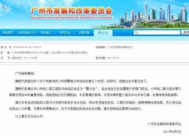 8月8日,广州市发展和改革委员会回复了魏朗代表提出的建议,关于站点命名问题,建议按照地名管理办法执行。据相关规定,广州地铁车站的命名原则为先用地片名,后用标志性场所,再用路名。但广州市地名办表示,将会充分考虑暨大的诉求,遵照以上命名原则申报站名方案,报市地名办审批。