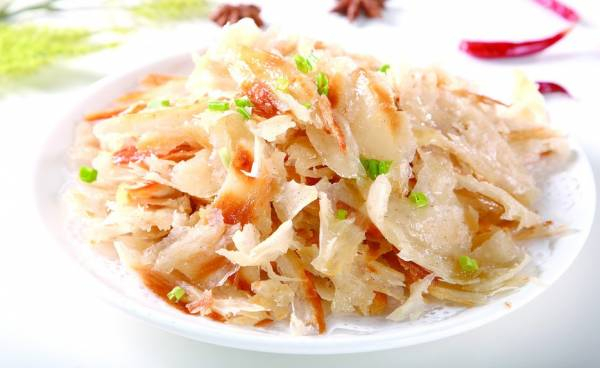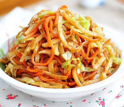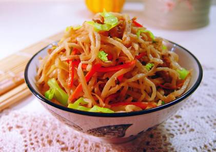 3)锅中再加入油,加热至7成热,放入红辣椒片,倒入烙饼丝,翻炒2分钟后倒入酱油,再倒入圆白菜丝继续翻炒至菜丝变软后,淋入少许米醋,放入盐和糖,炒好的肉丝,翻炒均匀后撒入少许味精即可。