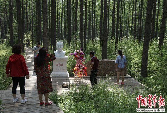 7月12日,河北省承德市围场满族蒙古族自治县,塞罕坝机械林场马蹄坑营林区王尚海纪念林,游客在王尚海像前驻足。王尚海是塞罕坝机械林场第一任党委书记。记者 李峥苨/摄