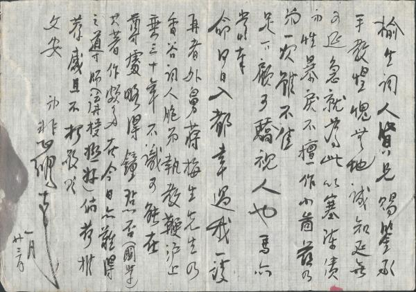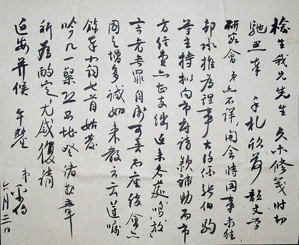 有一封是沙孟海先生写的,沙孟海两封信是钢笔写的,有一个是横着写的,墨水已经褪色了,颜色已经变掉了,这也是一个问题。里面提到一个问题很有趣,可能龙榆生先生和马先生有交往,问到了马老先生的近况,就说他得了白内障,眼睛白内障,不能写字了,要写只能写大字,只写卷首,这个信息有了以后,黄宾虹89岁得了白内障,之后画风有了很大的变化。马先生得了白内障,眼睛看不清楚,研究这段时间的书风的话,这个信息其实应该也是有帮助的,也是可以挖掘的。