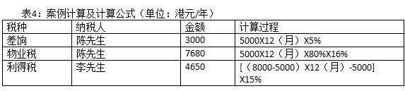 举例来说,香港居民陈先生以每月5000港元将其物业使用权出租给李先生,租期为20年,李先生将物业装修(摊到每年成本约5000港元)后以每月8000港元的价格转租给王先生。该案例中涉及的房产税及计算如下表: