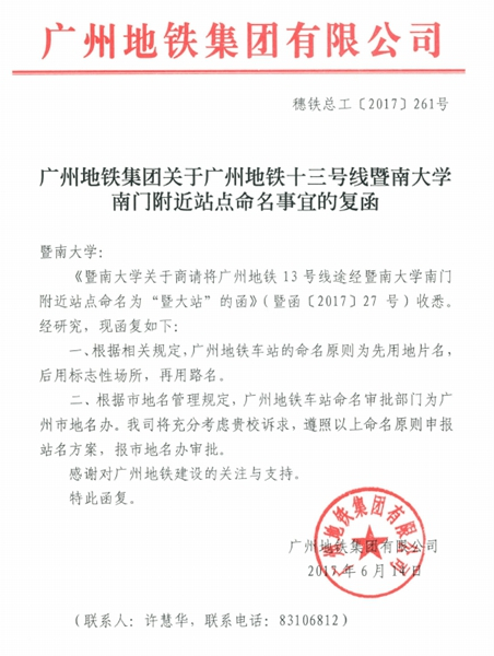 暨南大学5月16日即向广州市民政局区划地名处及广州地铁公司行文,表达学校对13号线途经暨南大学站点命名为暨大站的愿望。