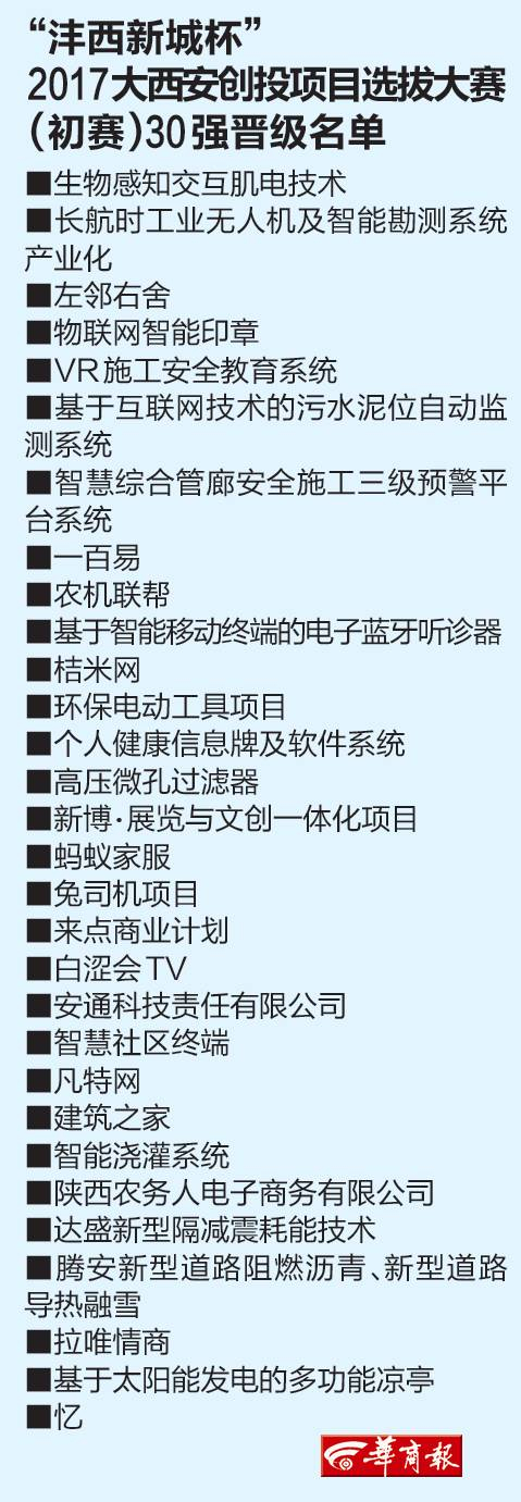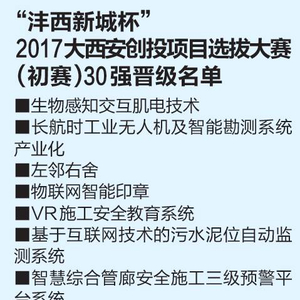 华商报记者在初赛现场看到,不少选手带着硬科技新发明齐上阵,通过PPT、短视频展示项目和团队。经过评委仔细甄选,“沣西新城杯”2017大西安创投项目选拔大赛30强项目出炉。华商报记者注意到,入选项目既有成熟技术和应用,也有科技创新,还有生活应用场景和解决方案。