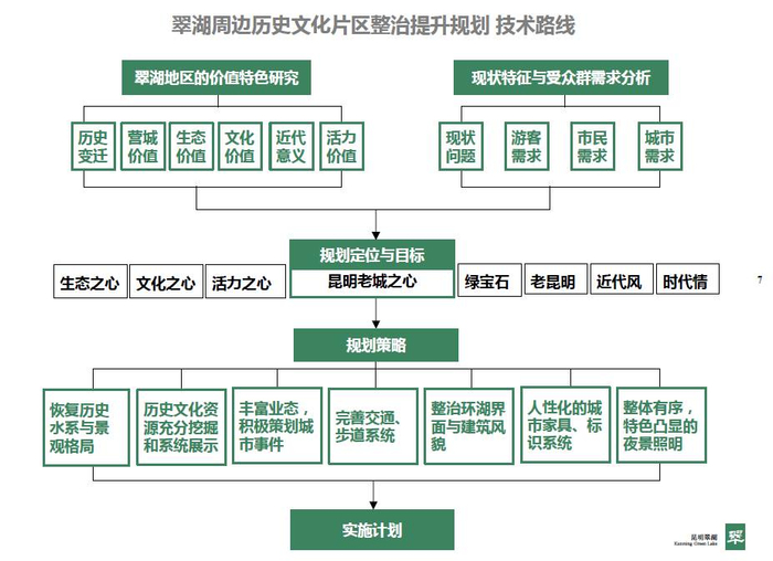 项目的主要思路是突出体现和彰显昆明乃至云南的历史文化,同时体现时尚元素,让翠湖的历史文化、近代文化、时尚文化有机融合、交相辉映。通过打开北门片区连通云大的翠湖视廊,恢复洗马河历史水系,加强城市山水连通,实现“水清岸绿灯靓景美”的连续性景观,以“大翠湖”形象展示城市生态名片,还市民一个不一样的翠湖。