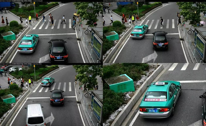 11日,记者在广州市公安局交警支队指挥中心看到,大屏幕上显示了4张电子警察抓拍一辆的士不礼让斑马线行为的图片:前3张记录下了这辆的士进入斑马线后,与路人争抢路权的行为过程;最后一张则是车辆的特写,便于记录其车身与车牌号等信息。