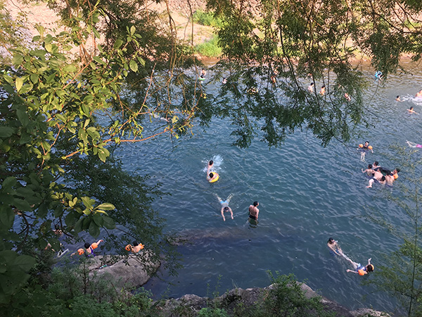 溪里水质清澈,河库平坦。鹅卵石被冲刷得光滑圆润。在这里游泳,最好穿着凉鞋下水,不然可能会有点硌脚。只是临近傍晚,来这里下水的人逐渐多了起来,从岸上远眺泳池,难免嫌乱。