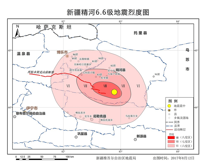 2017年8月9日,新疆精河发生6.6级地震。中国地震局现场工作队依照《地震现场工作:调查规范》(GB/T 18208.3-2011)、《中国地震烈度表》(GB/T 17742-2008),通过灾区震害调查,确定了此次地震的烈度分布。