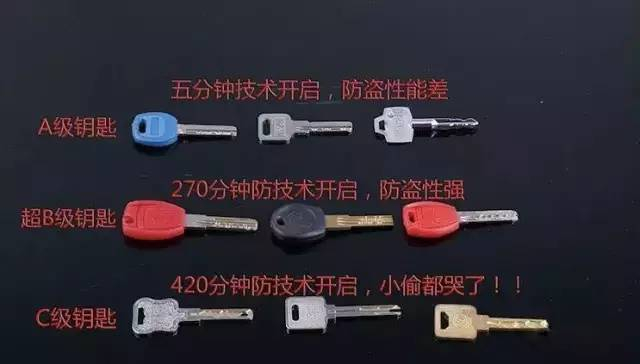 目前市面上的防盗门锁芯按安全等级不同,分为A级、B级、超B级(也称为C级)三个等级,市民们可以从钥匙的形态来辨别自家门锁的安全等级。