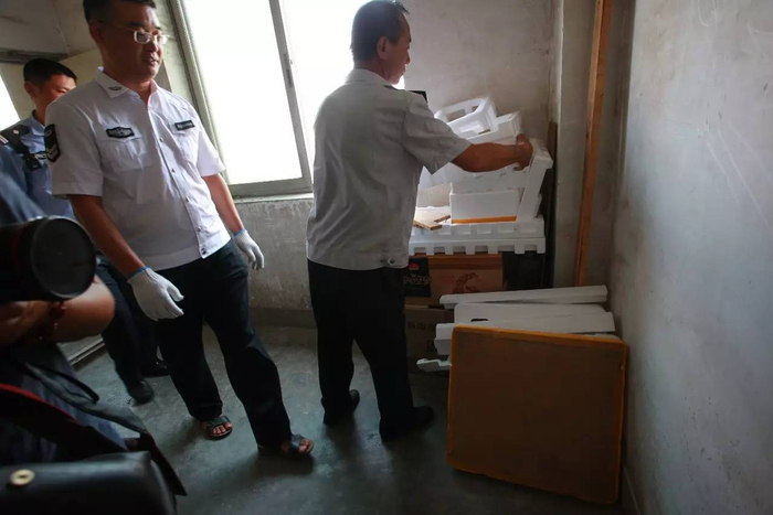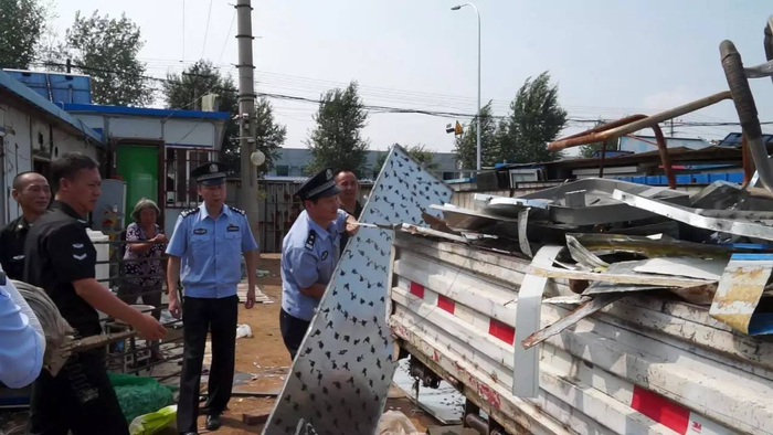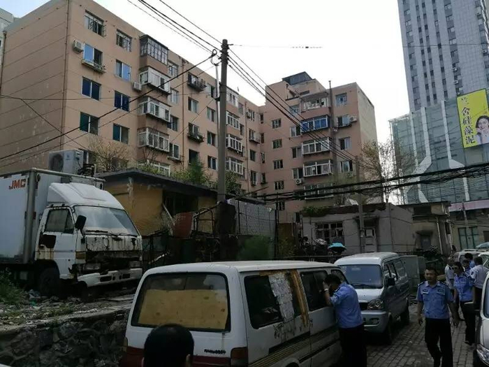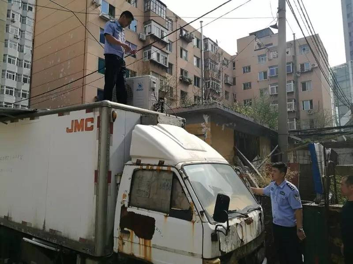在马栏街22-28号院,民警们清理了一台严重影响小区居民生活和安全的“冷库”僵尸车。这辆厢式卡车被马栏市场摊贩改装后放在院内,用来保存海鲜:车厢内安装了空调用来制冷和输氧,空调外挂机就焊在车厢外的顶棚上,而使用的电源则是从小区内的居 民供电网和路灯杆上接进来的。