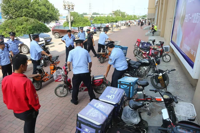 在中华路南侧公交停车场,一位老妇私自在道边摆摊卖报纸,被民警搬进了停车场内;在麦当劳门口,见10余辆送外卖的摩托车无序摆放,民警又逐一将这些车辆归拢至墙角,整齐划一摆放。