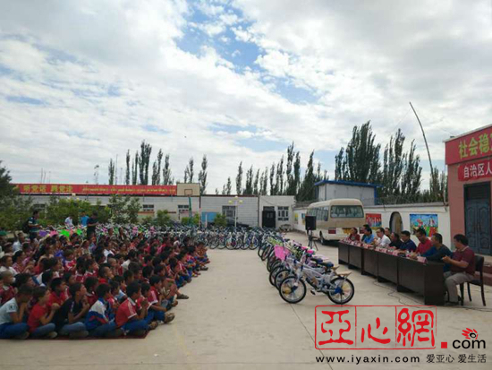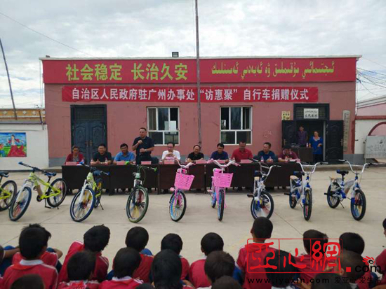 亚心网讯 (通讯员殷宏建)8月11日,自治区人民政府办公厅驻广州办事处在英阿瓦提乡托普恰克(10)村举行自治区人民政府驻广州办事处“访惠聚”自行车捐赠仪式,给该村小学、初中的孩子们发放100辆自行车,解决孩子们上学难的问题。