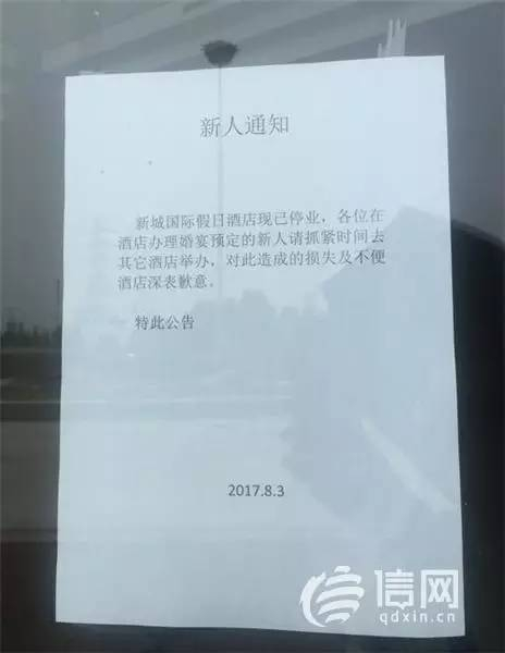 "新城国际假日酒店现已停业,各位在酒店办理婚宴预订的新人请抓紧时间去其他酒店举办,对此造成的损失及不便酒店深表歉意。"9日上午,信网来到新城国际假日酒店,酒店只在门口张贴了停业通知,看不到任何工作人员。