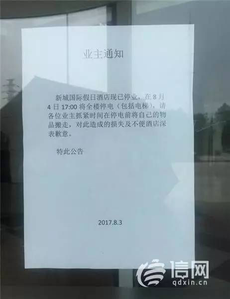 而在另一份通知上,信网看到新城国际假日酒店是在8月4日彻底停电关门的,酒店方面提前贴要求所有业主将个人物品搬走。如今,新城国际假日酒店的整座大楼都空空荡荡的,之后酒店外大红色的广告依旧存在,可"婚礼酒店"的字眼在此时却显得有些名不副实。