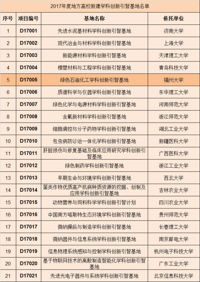 日前,国家外专局和教育部正式公布了2017年度地方高校“高等学校学科创新引智计划”(即“111计划”)立项名单,全国共有21所地方强校获批,我省福州大学再次入选。