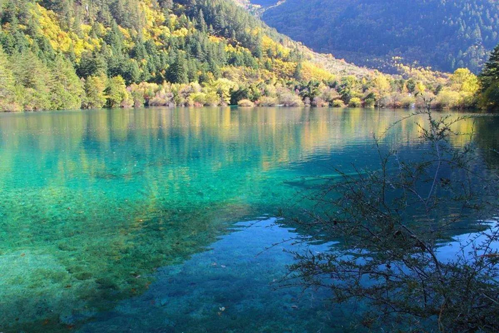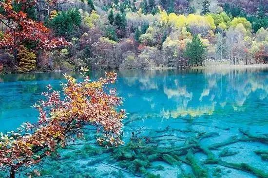 五花海有"九寨沟一绝"和"九寨精华"之誉。海拔2472米,位于珍珠滩瀑布之上,熊猫海的下部。清澈多彩的湖面下显现出一段段的树木躯干。湖面整体呈绿松色,不同区域,颜色变换从黄色到绿色,又到蓝色,展现出湖水五彩的美艳。
