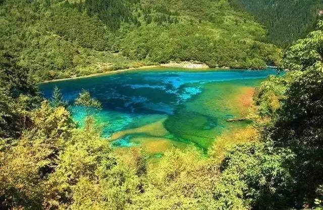 曾经的五花海,一湖之中色彩斑驳,由于湖中各色植物和湖低的钙华沉积,呈现出一个混合鹅黄、深蓝、墨绿、浅红等颜色的彩色图景。整个九寨蓝说的就是这个海子。