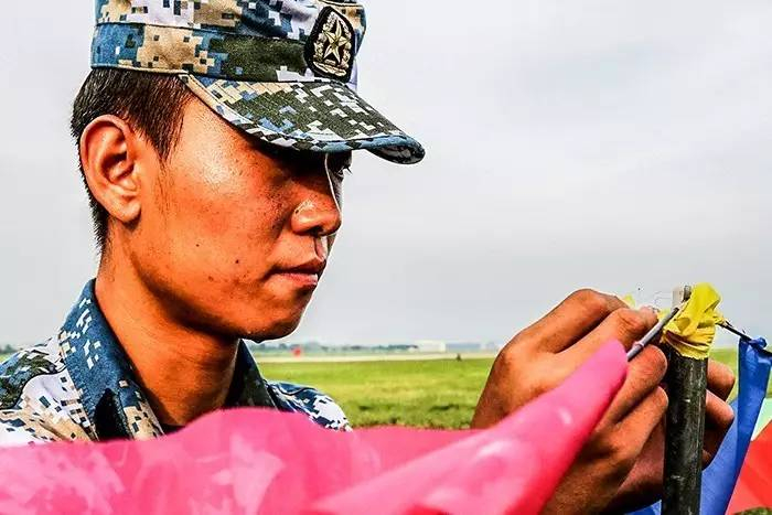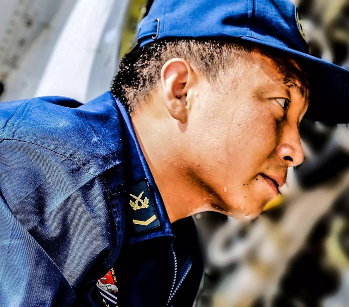 辽东半岛某地持续高温,某团机械员高鹏保养飞机发动机。喷口处的高温气体不断加热,汗水顺着他的后背流进衣裤里。