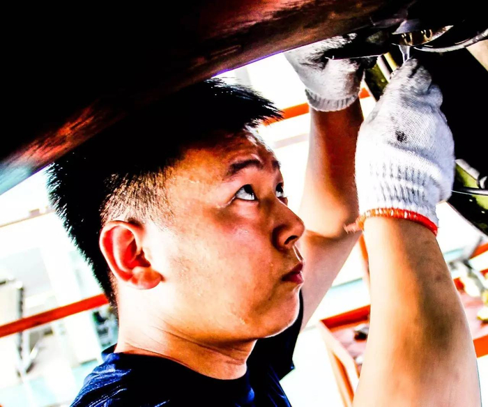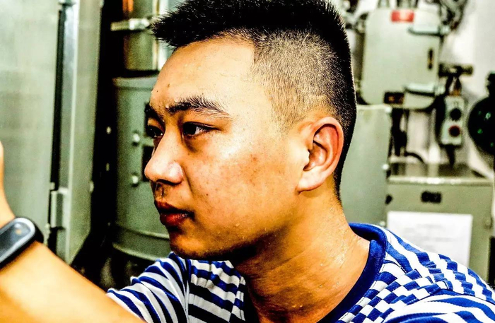 浙东某地持续40度高温,某登陆舰大队嵊山舰主机兵陈俊安钻进舱底紧固管路阀门。陈俊安执掌的装备中管路阀门达上百种,汗水早就湿透了衣背。