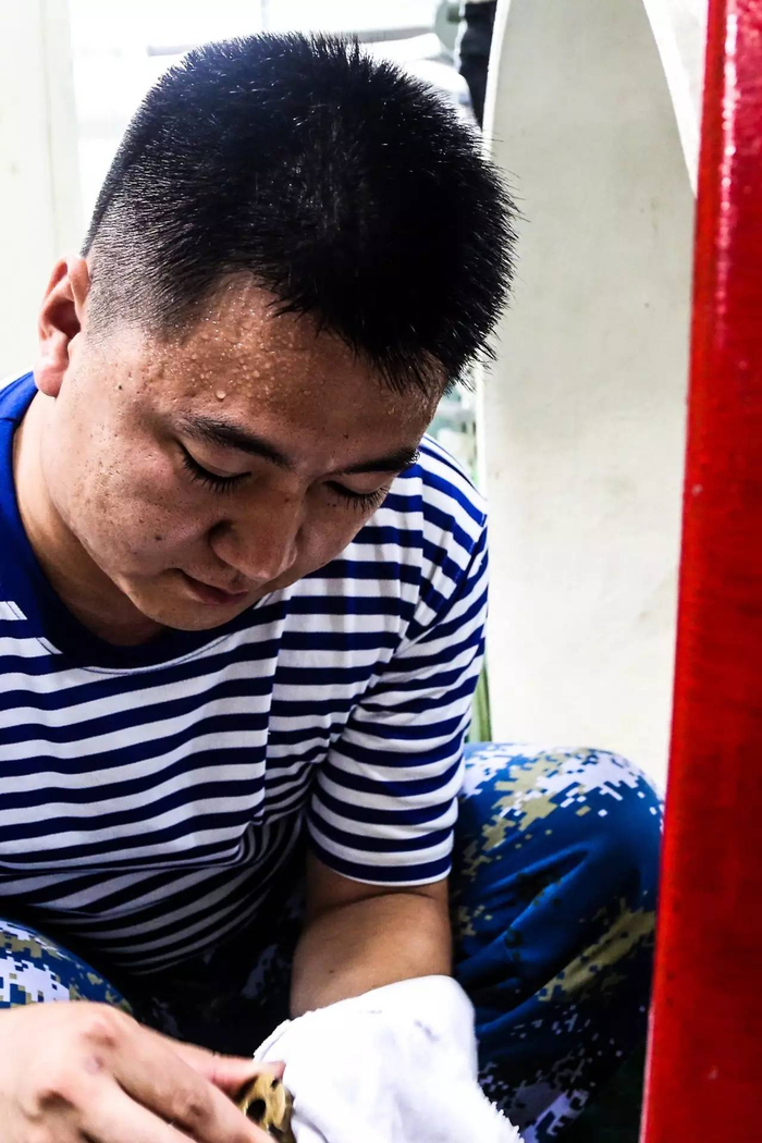 海军湘潭舰帆缆兵林华斌一手拿着板刷,一手手持装备,在上铜油,豆大的汗珠挂满脸庞。