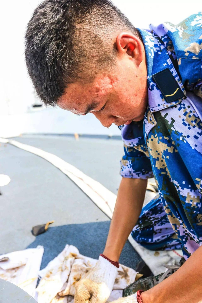 海军湘潭舰战士邹科迎着烈日进行除锈保养,汗如雨下。
