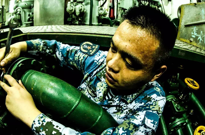 某潜艇支队某艇班长梁中华在狭小的空间中擦拭着电池。蓄电池是舰艇动力的”能量站”,蓄电池有几百块,每一块都关系着潜艇的续航力和战斗力。