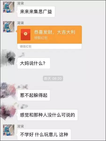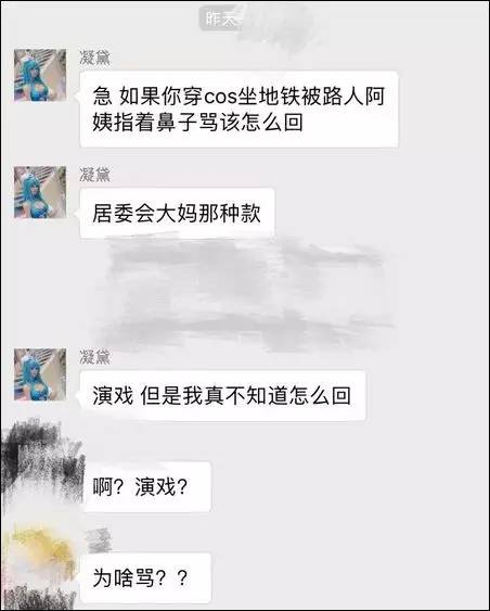 而网上盛传的另一组聊天截图显示,凝黛在某个群里问:“如果你穿cos坐地铁被路人阿姨指着鼻子骂该怎么回”,并指明是在“演戏”。