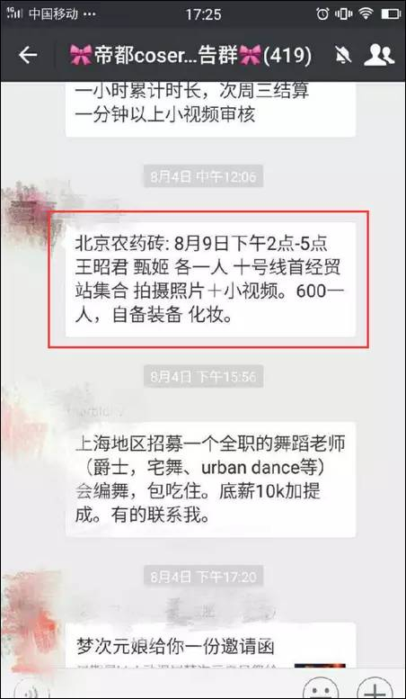 记者采访到了知情人士(应采访对象要求,以下化名“网友A”),知情人士透露,凝黛所说的“工作”,是在一个叫“北京coser通告群”里接到的通告。