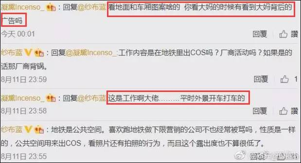 她在评论里和网友互动时,表示自己穿cosplay服装上地铁,是去工作的,并让网友注意地面和车厢的图案:“你看大妈的时候,有看到大妈背后的广告吗?”