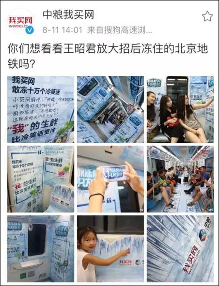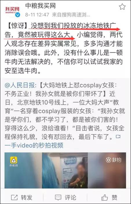 再后来,@中粮我买网又说,“大妈刚好不偏不倚出现在投放广告的地铁里”,暗示这只是巧合,似乎是在否认炒作。