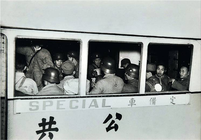 “八百孤军”相继登上公共汽车,车厢上还写着“定备车”字样。来源:中国嘉德