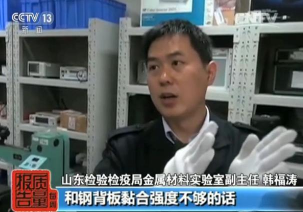 山东检验检疫局金属材料实验室副主任 韩福涛:这个就是模拟这个刹车过程中如果它这个摩擦材料和钢背板粘合强度不够的话,然后在使用过程中有可能刹车的时候会和背板发生脱离,那就起不到这个刹车制动的作用,引起制动失灵,有可能引起安全隐患。