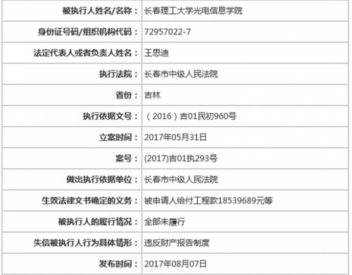 其中,长春理工大学光电信息学院的失信记录有一条:发布时间为2017年8月7日,其生效法律文书确定的义务为“被申请人给付工程款18539689元等”,被执行人的履行情况为“全部未履行”,失信被执行人行为具体情形为违反财产报告制度,该案件的执行法院为长春市中级人民法院。