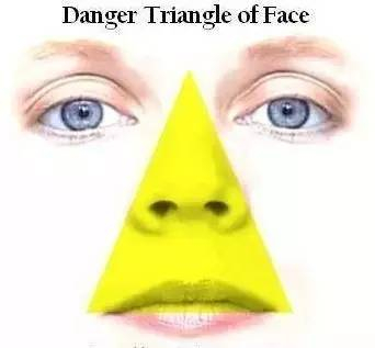 所谓“危险三角区”说的是鼻子和嘴角组成的一个三角形的区域,大脑中静脉、眼静脉和视网膜中央静脉的血液都汇聚到这里。动眼神经、滑车神经、眼神经和上颌神经也从这里通过。是当之无愧的“危险区域”。