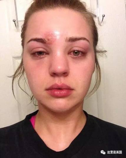 48小时后,妹子的脸变成了这样......挤破的痘痘附近溃烂了,左眼也肿得快睁不开了。