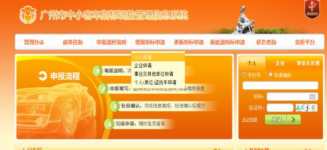 登录广州市中小客车指标调控管理信息系统网站(jtzl.gzjt.gov.cn),选择“个人申请”。