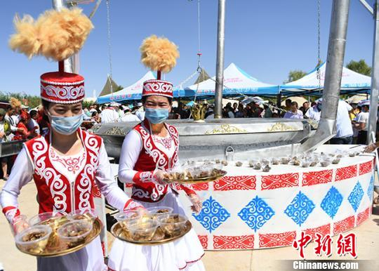 第三届哈萨克美食文化节12日在甘肃酒泉市阿克塞县开幕。世界最大平底锅现场选用60余只哈尔腾草原纯正无污染绿色羊羔肉,用哈萨克族传统方式,历时3个多小时炕制而成哈萨克族炕锅肉,引大批民众围观“抢食”。 杨艳敏 摄