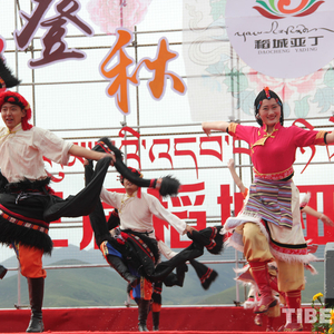 中国西藏网讯 12 日上午, 2017 年第三届稻城亚丁"登秋节"正式开幕。"登秋节"意为送夏迎秋节,是当地重要的民俗文化节。节日期间,当地群众在草原上搭起帐篷、铺上地毯,摆上各种小吃,或打牌聊天、或载歌载舞。图为开幕式歌舞。