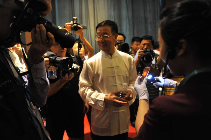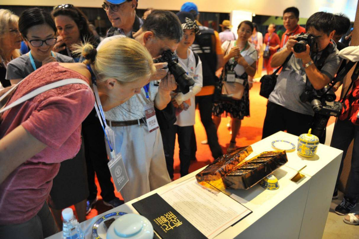 国家非物质文化遗产东阿阿胶制作技艺代表性传承人、东阿阿胶总裁秦玉峰向外国友人展示阿胶中的极品——九朝贡胶的“光透如琥珀”。