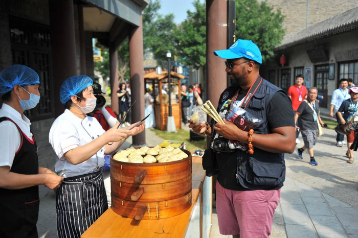 俗话说:天上龙肉,地上驴肉。外国友人品尝美味的东阿驴肉包。