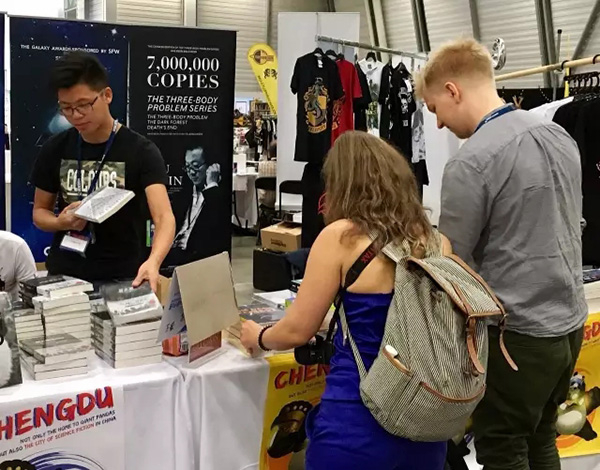 据在世界科幻大会现场的未来事物管理局合伙人“兔子瞧”介绍,《科幻世界》在市集的展位后竖起刘慈欣的巨幅海报,赠送印刷精美的《中国科幻》手册。8月11日下午签售结束后,《三体》英文版已经销售一空。未来事物管理局在Regional con区域的展位上介绍中国科幻作家和科幻圈文化,发出明年4月亚太地区首个科幻大会——APSFcon的邀请,和世界各地赶来的科幻杂志编辑、作者和活动家相认。其余的中国代表团在报告厅、餐厅和展区之间忙碌地游移,10日晚上的中国科幻派对人山人海,这几天,每场有关中国科幻的小组都人数爆满。