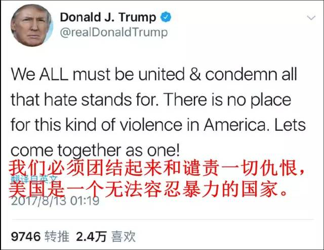 对于此事,特朗普于13日发推称,“我们必须团结起来和谴责一切仇恨,美国是一个无法容忍暴力的国家。”