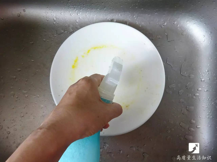 将自制洗洁精喷在沾满油污的盘子上
