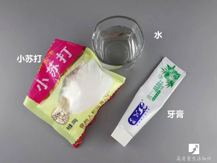 材料:小苏打1勺,牙膏1段,水1杯