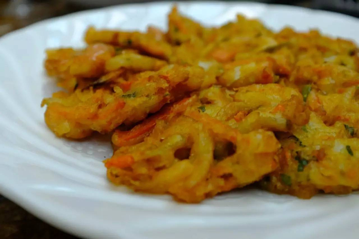 ▲福建虾饼作为一道特色小吃点心也颇受欢迎,胡萝卜丝和土豆丝裹浆后和虾仁一起炸得金黄焦脆,酥香软糯又包裹着丰富的食材,老少皆宜。