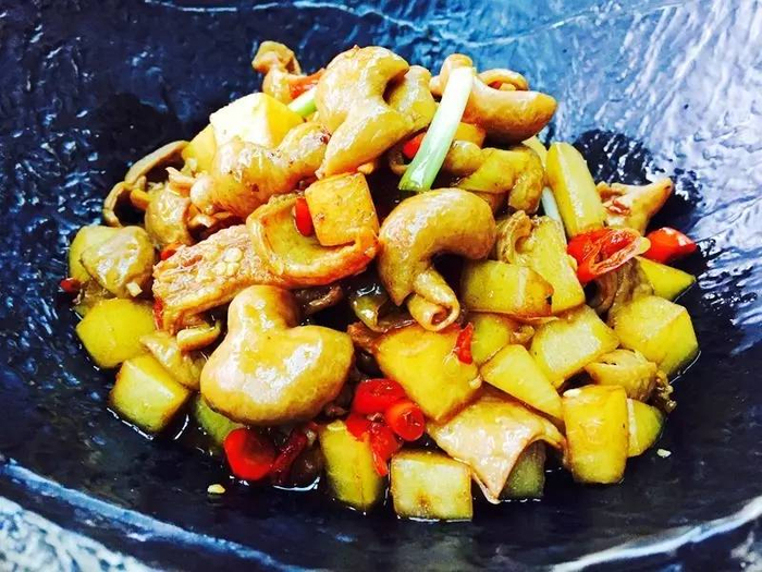 ▲酸萝卜焖肥肠是一道开胃下饭的好菜,酸脆的萝卜丁和肥肠一起爆炒焖烧,味型互补,香辣爽口。
