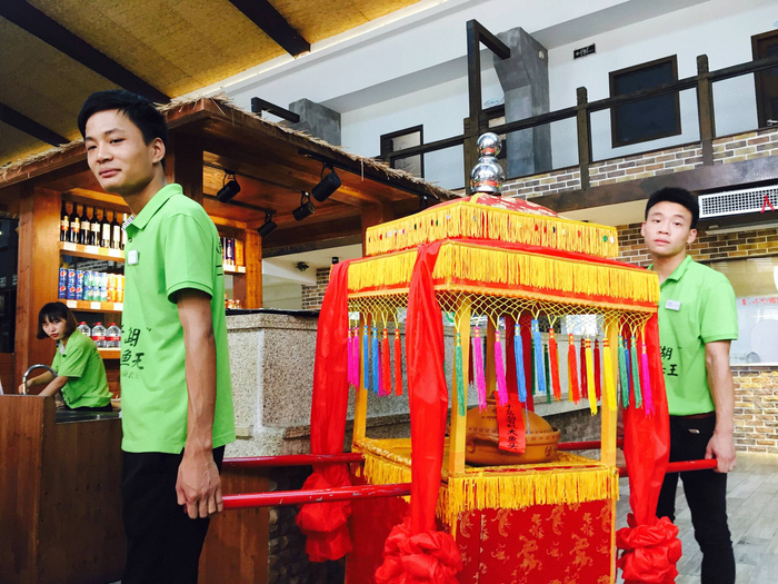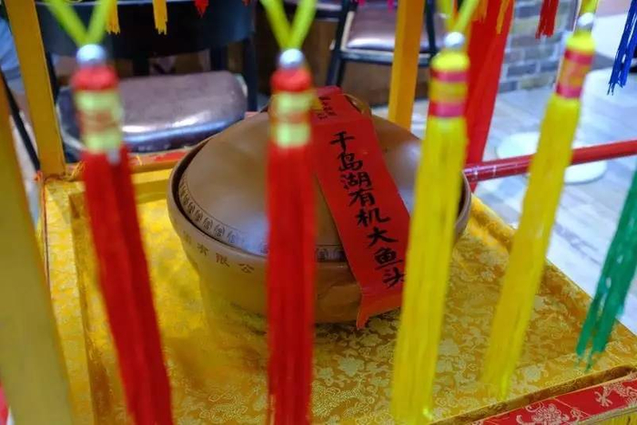 这道千岛湖野生鱼头的上桌也颇有仪式感——它是坐着花轿“嫁”给味蕾的。伴着热闹喜庆的锣鼓声,端坐花轿中的鱼头才千呼万唤始出来,鱼头上桌,先由服务员隆重介绍,再邀请一位客人揭开锅盖,那过程就像掀起了新娘的红盖头,美人这才露出庐山真面目。