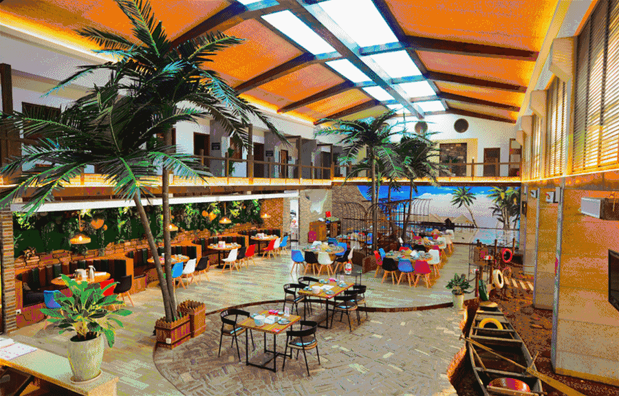 2000多平米的餐厅,既有露台散座又有室内大厅、包厢,层高十多米的半圆拱形的屋顶,配上蓝天白云的琉璃,配上12棵高大的椰子树、3个沙滩区、一个攀岩墙、还有一条人工小溪流环绕其间,让人有在风景区度假的错觉。