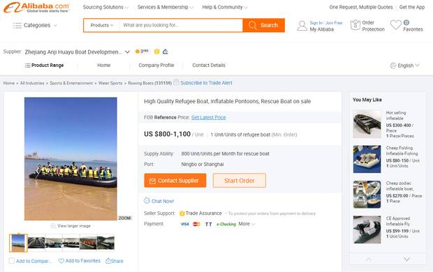 据中东眼报道,这款橡皮艇在阿里巴巴英文网站上的标注是:“High Quality Refugee Boat, Inflatable Pontoons, Rescue Boat”(高质量难民船、充气皮艇、救援船)。售价是800-1100美元(约合5330元-7330元人民币)。