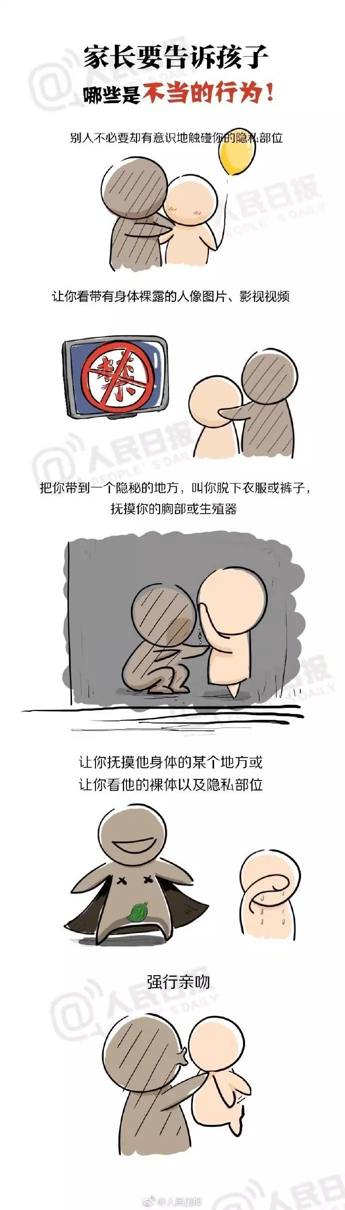 ①背心裤衩覆盖的地方不许别人碰;②知道不让别人碰是自己的权利;③避免和陌生人搭腔,或独自和陌生人在封闭环境中接触;④不随便接受陌生人给的饮料或视频;⑤尽量不在别人家夜宿;⑥如果有人告诉你,这件事不要告诉父母,那么一定要教孩子告诉父母!