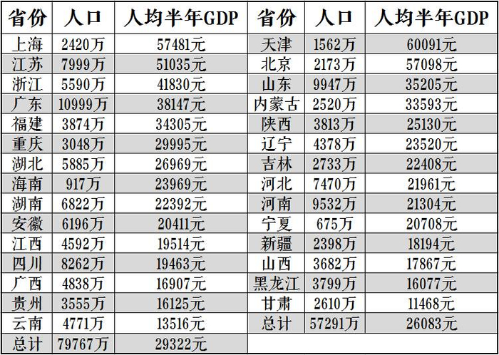 * 西藏常住人口331万,人均半年GDP 16803元;青海常住人口593万,人均半年GDP 20293元。港澳台暂无数据。